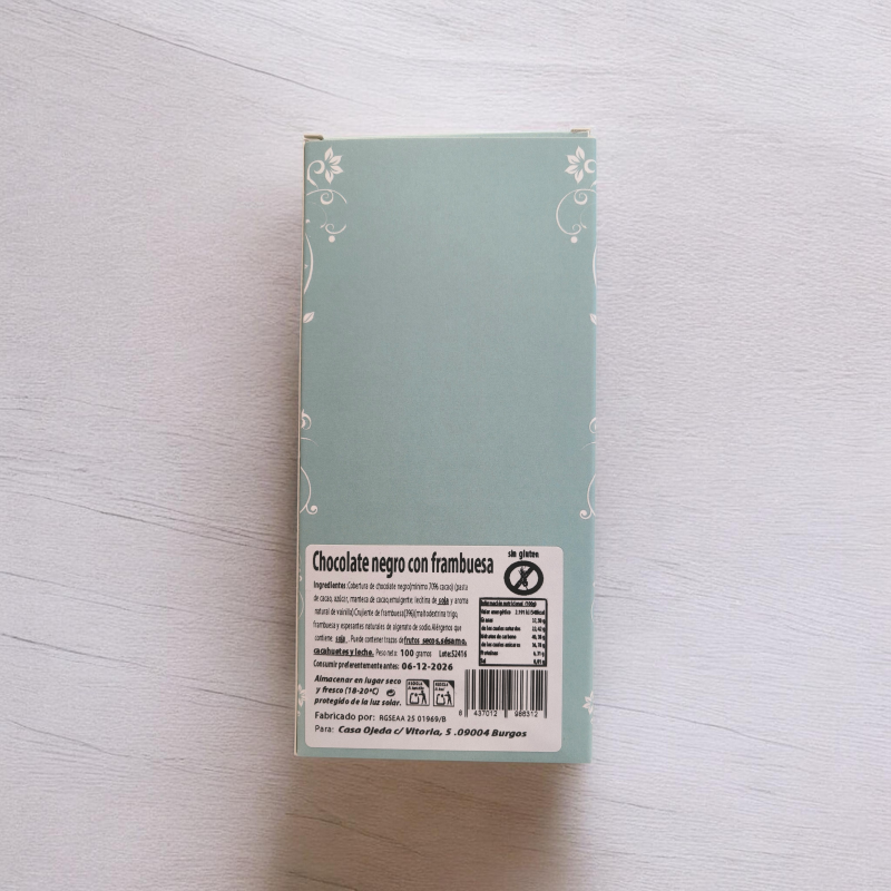 CHOCOLATE NEGRO 70% CON FRAMBUESA DESHIDRATADA 100 GRS SIN GLUTEN